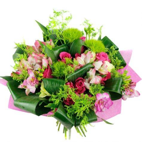 Яркий и оригинальный букет из розовых роз, нежной фрезии в оригинальном оформлении.